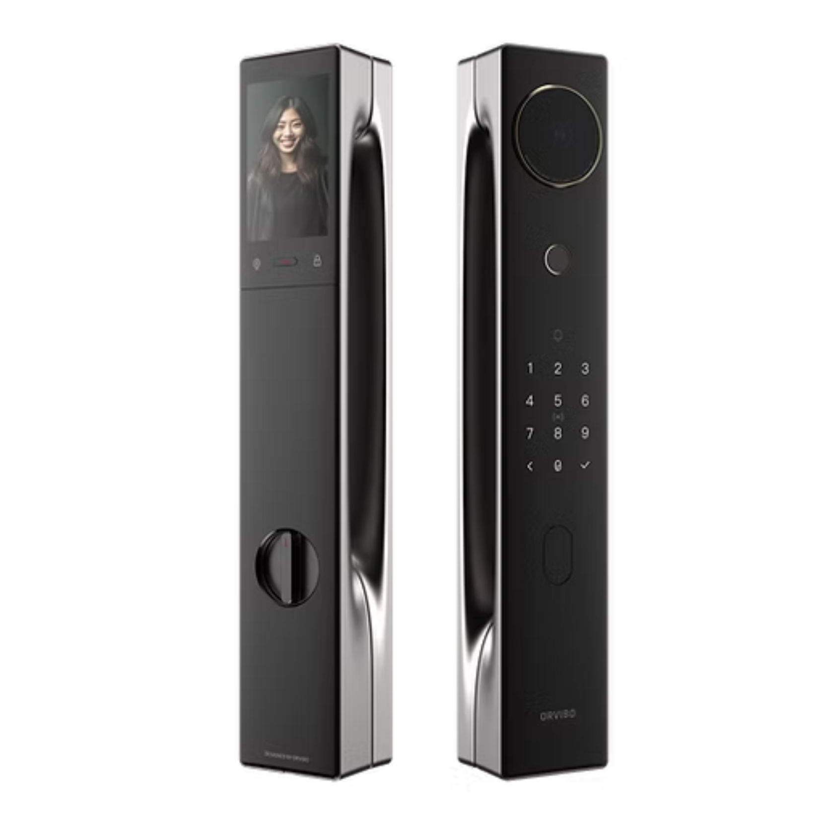 Com um design elegante e diferenciado, a maçaneta permite acionamento por biometria para configuração pessoal de cenas e conta com uma entrada USB-C 5V em caso de falta de bateria/energia.